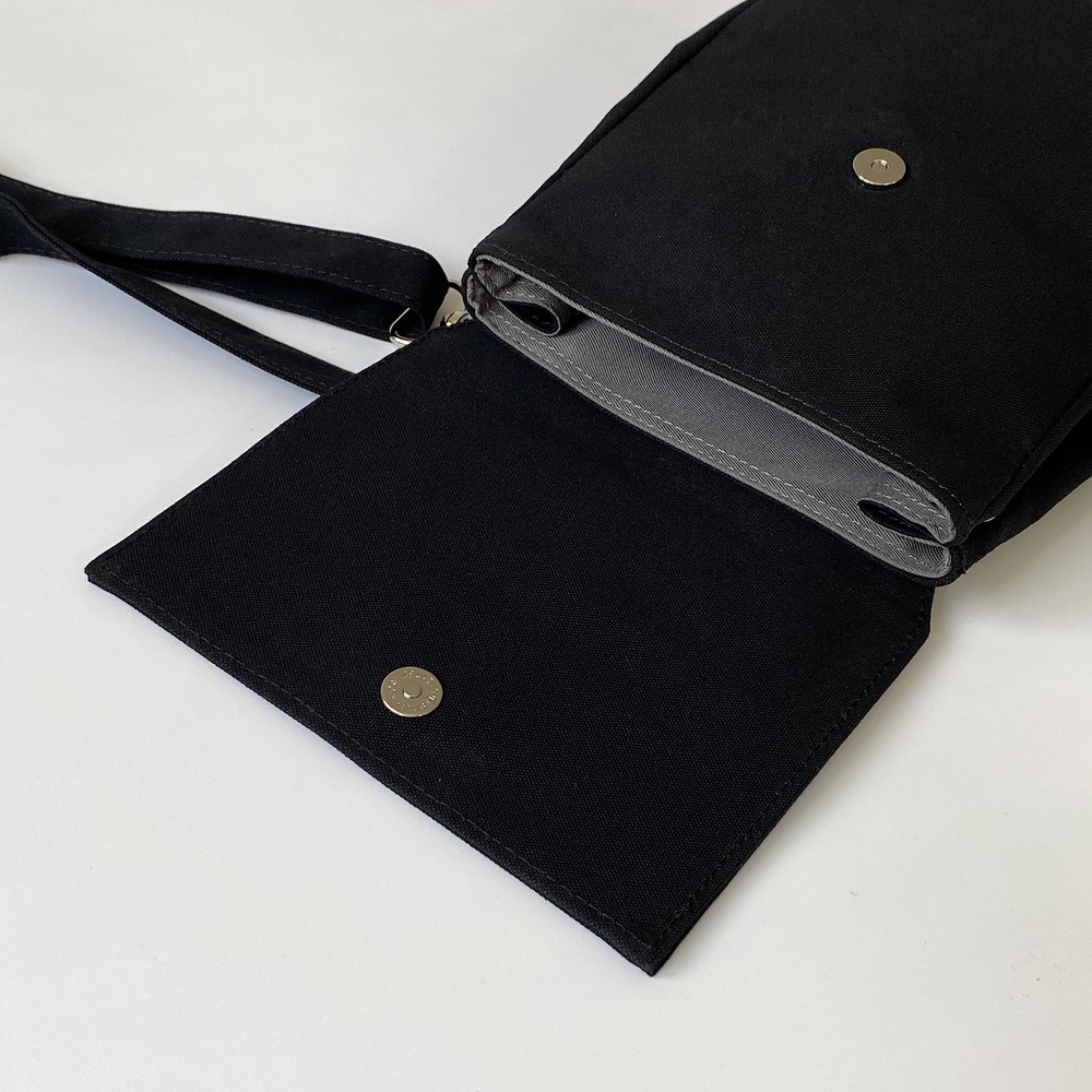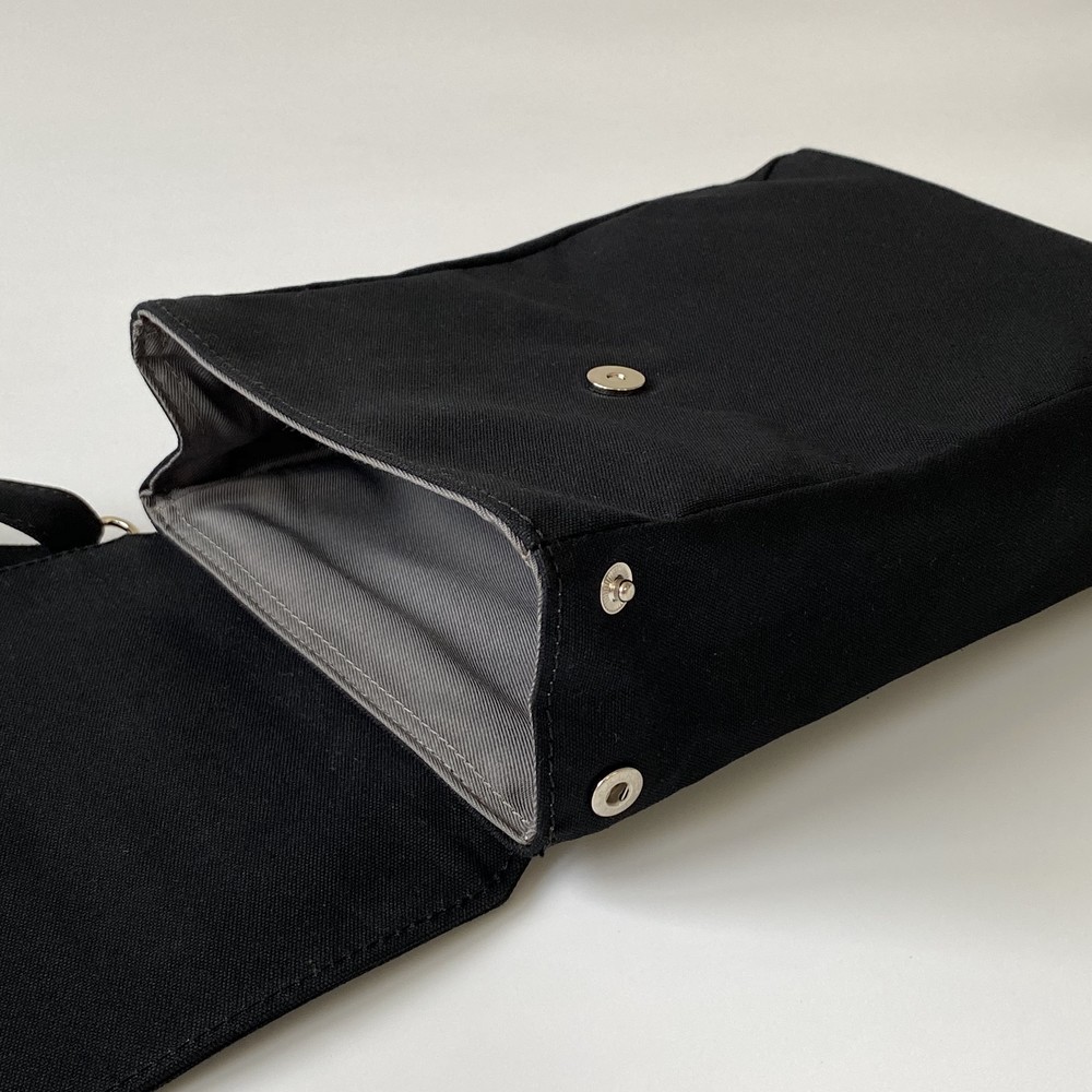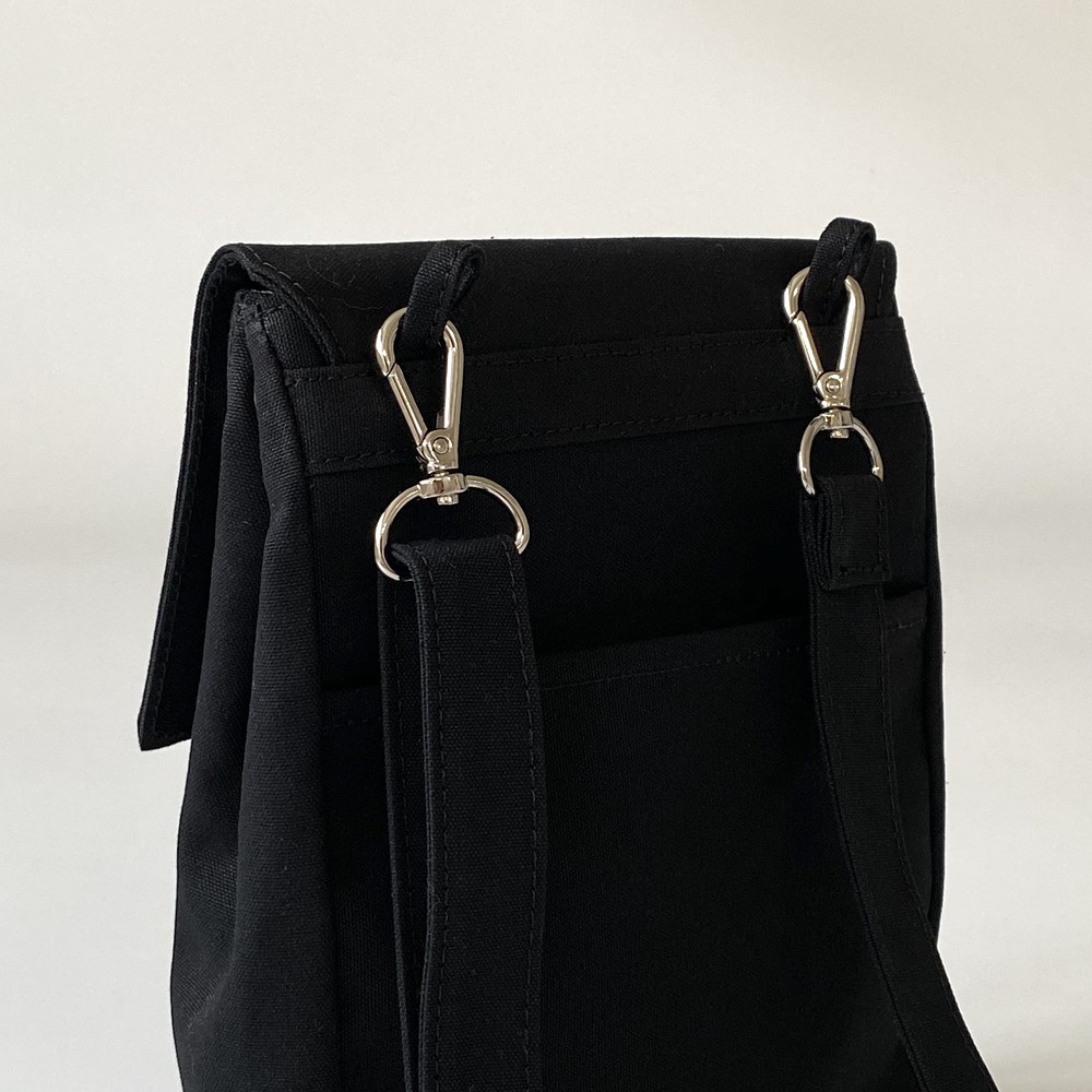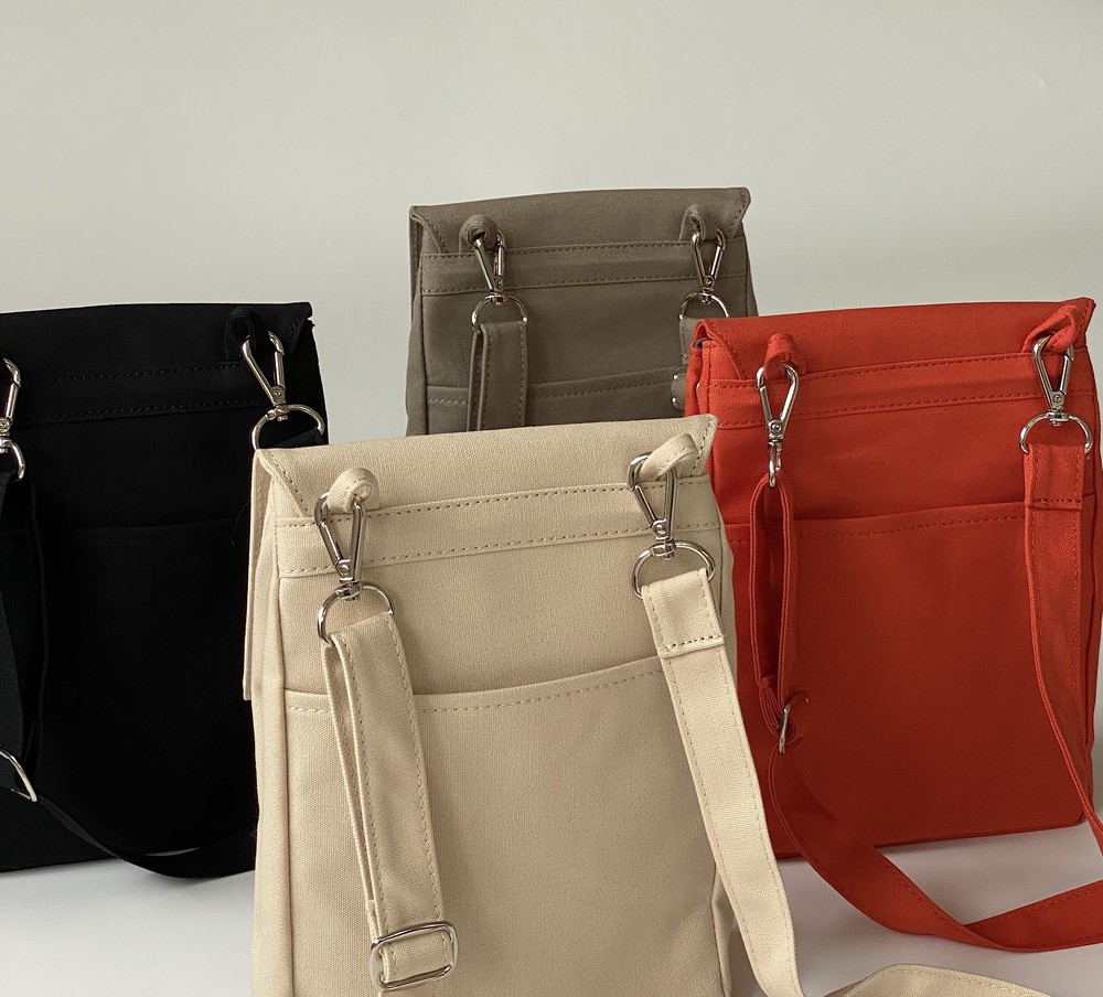 접히는 옆라인을 제외하고 가방 앞,뒤 그리고 뚜껑 안에 전체적으로 덧대는 3중 작업을 하여 견고하고 내구성이 튼튼합니다. 잘 보이지 않는 안감의 색감과 원단까지 신경썼습니다. 바닥재에는 단단한 가죽판을 안에 넣어, 천 특유의 부드러움과 가죽가방의 단단함이 공존하여 물건을 넣어도 쳐짐이 없습니다. 깊고 넓은 안주머니와, 가방 외부의 뒷면 주머니는 자주 사용하는 핸드폰과 카드, 요즘 필수품인 마스크를 잠시 수납하기에 편리합니다. 원단은 섬세한 염색 작업으로 독특한 색감과, 20수3합으로 일반적인 천보다 조직이 견고하며 짜임이 좋습니다. 스트랩은 크로스,숄더로 조절 가능합니다.