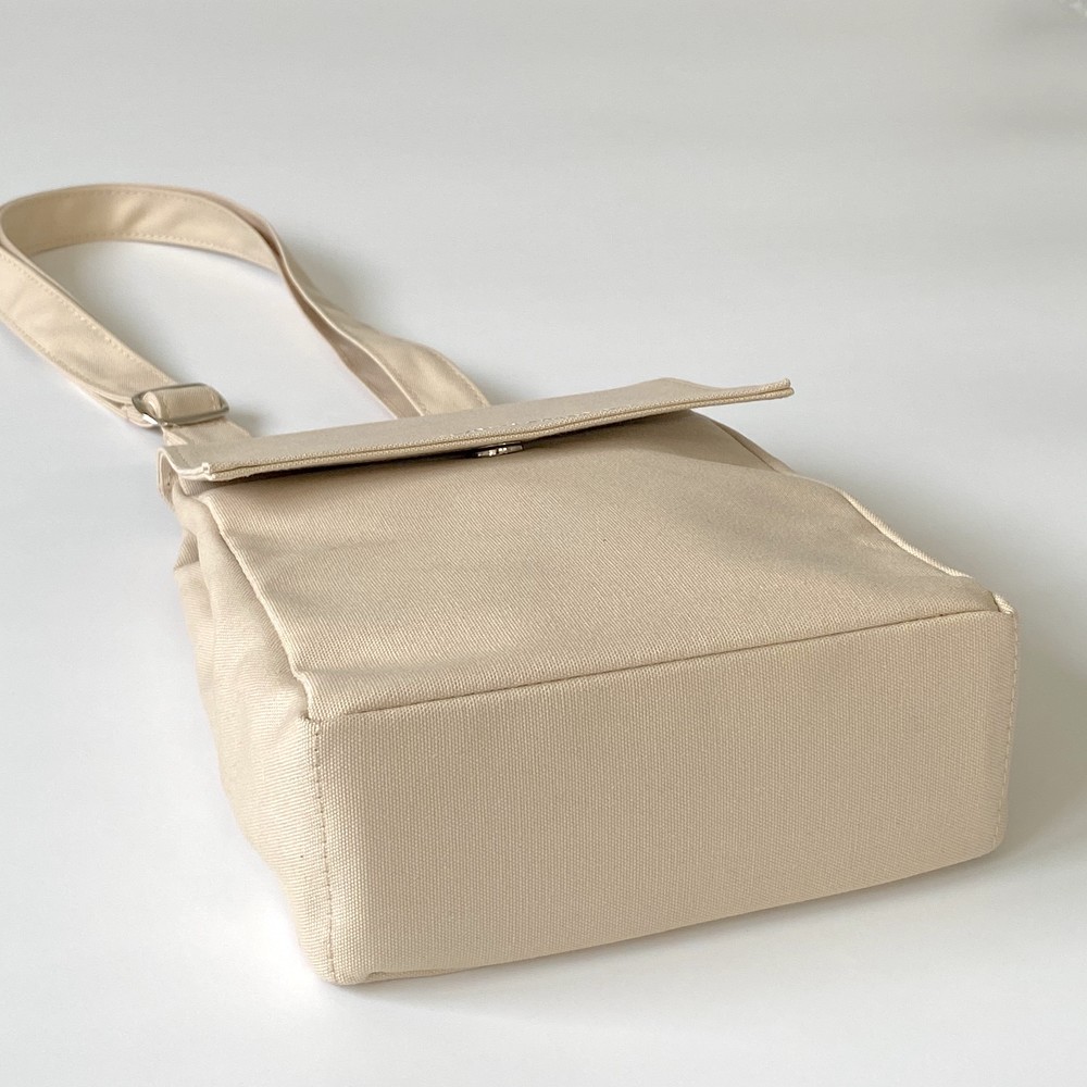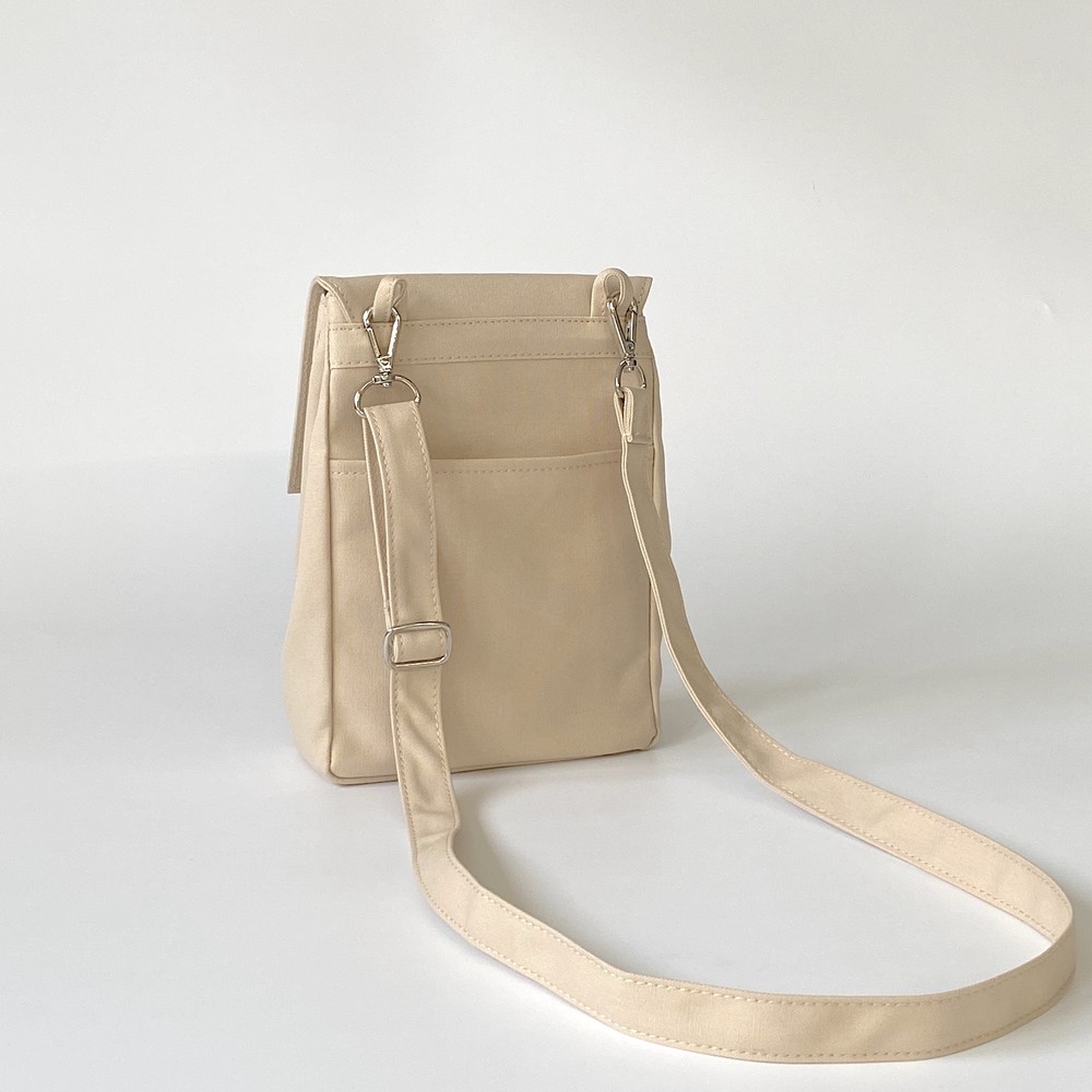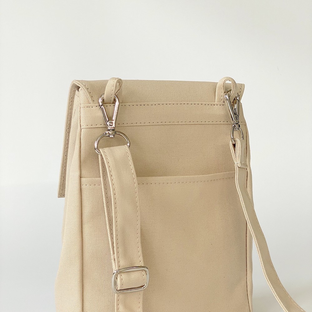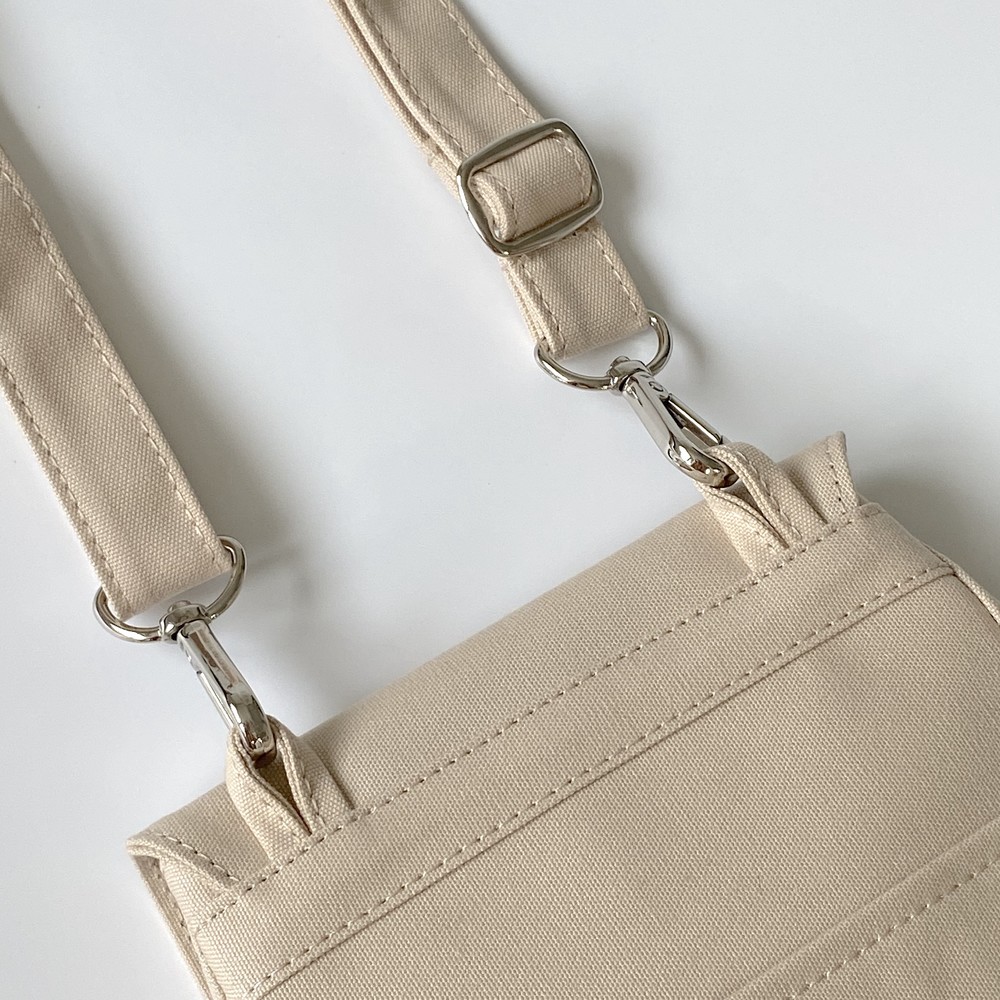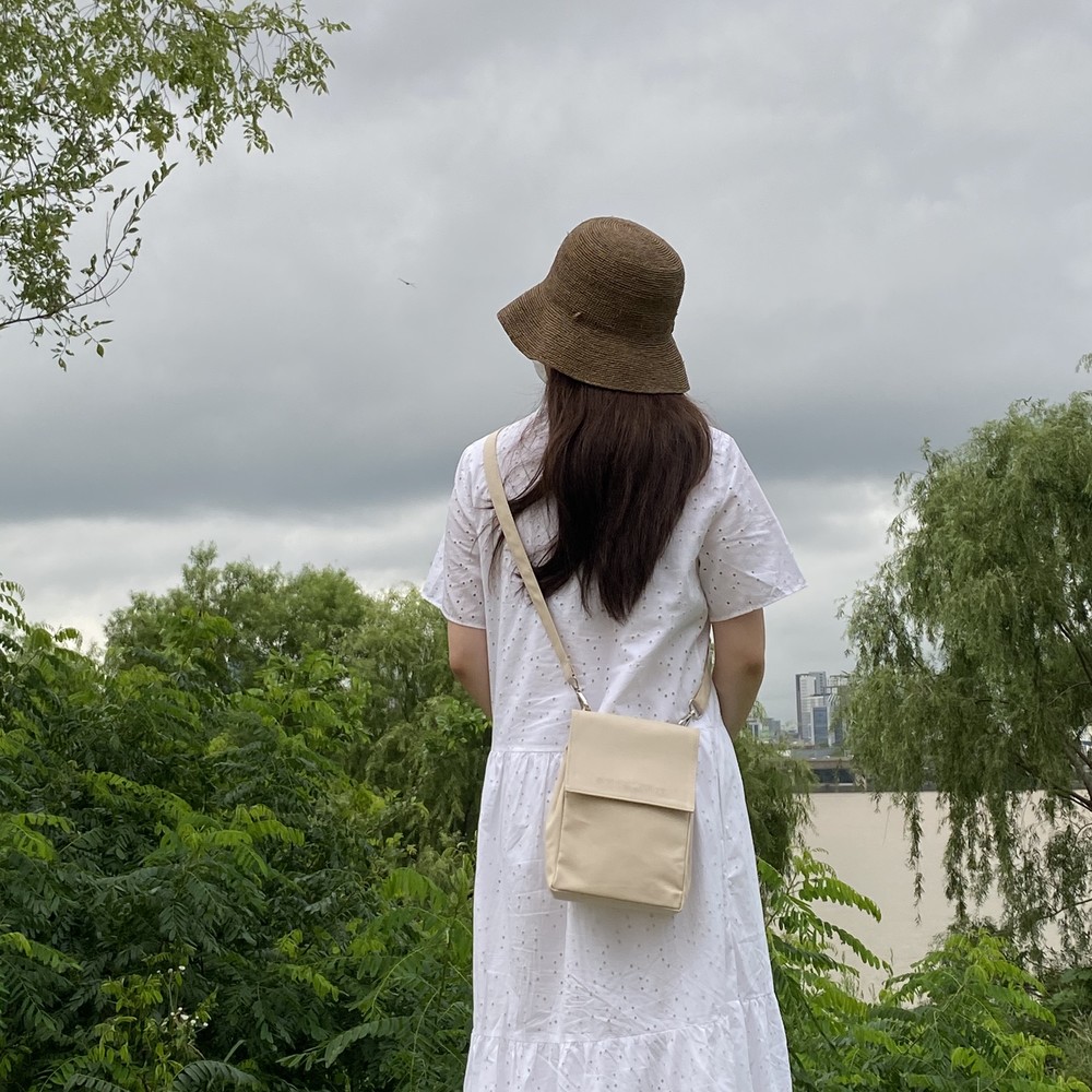 접히는 옆라인을 제외하고 가방 앞,뒤 그리고 뚜껑 안에 전체적으로 덧대는 3중 작업을 하여 견고하고 내구성이 튼튼합니다. 잘 보이지 않는 안감의 색감과 원단까지 신경썼습니다. 바닥재에는 단단한 가죽판을 안에 넣어, 천 특유의 부드러움과 가죽가방의 단단함이 공존하여 물건을 넣어도 쳐짐이 없습니다. 깊고 넓은 안주머니와, 가방 외부의 뒷면 주머니는 자주 사용하는 핸드폰과 카드, 요즘 필수품인 마스크를 잠시 수납하기에 편리합니다. 원단은 섬세한 염색 작업으로 독특한 색감과, 20수3합으로 일반적인 천보다 조직이 견고하며 짜임이 좋습니다. 스트랩은 크로스,숄더로 조절 가능합니다.