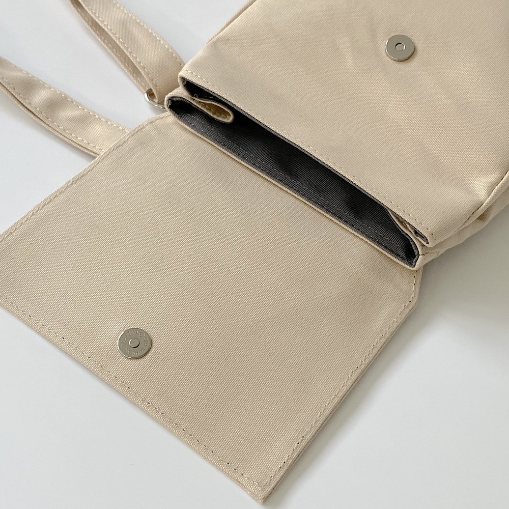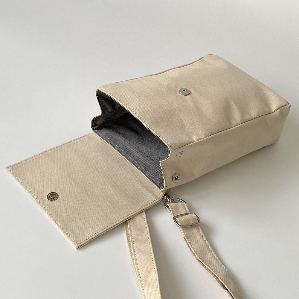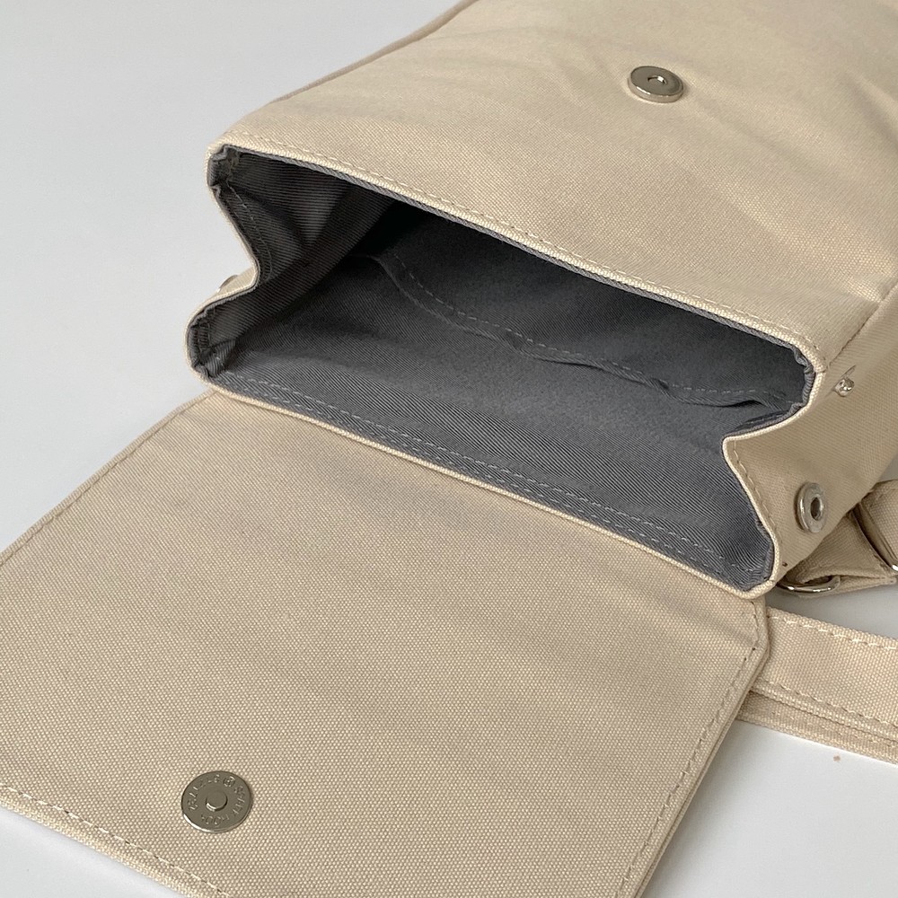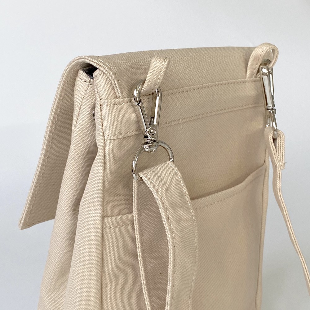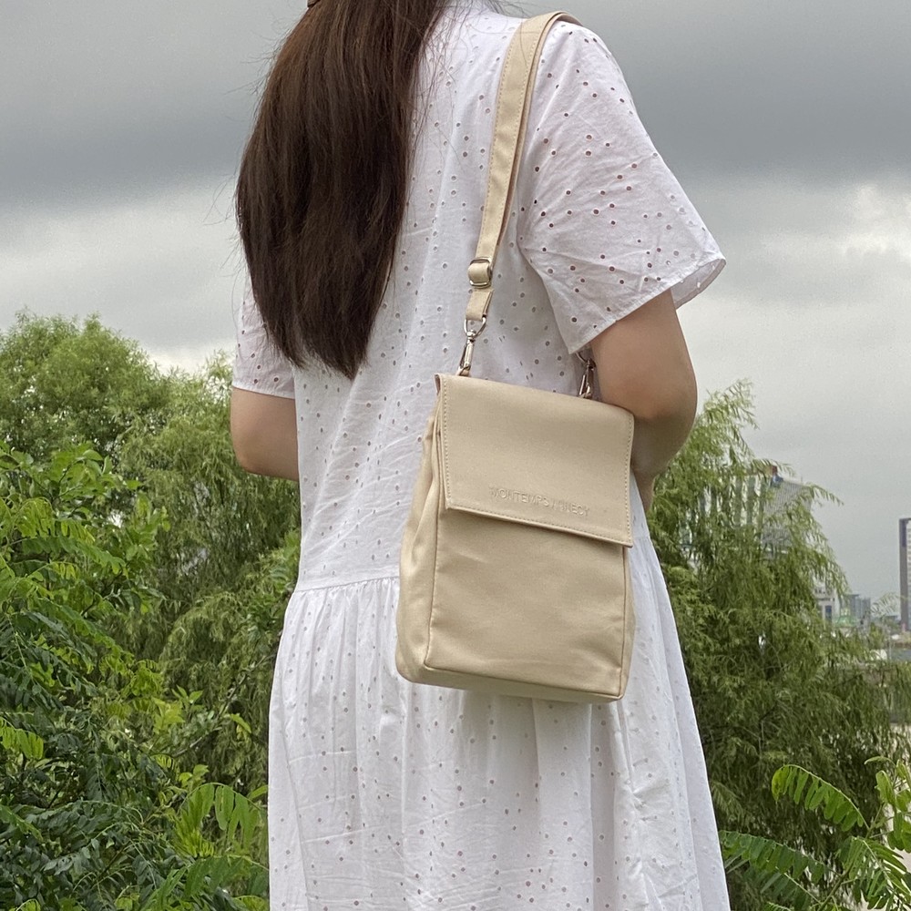 접히는 옆라인을 제외하고 가방 앞,뒤 그리고 뚜껑 안에 전체적으로 덧대는 3중 작업을 하여 견고하고 내구성이 튼튼합니다. 잘 보이지 않는 안감의 색감과 원단까지 신경썼습니다. 바닥재에는 단단한 가죽판을 안에 넣어, 천 특유의 부드러움과 가죽가방의 단단함이 공존하여 물건을 넣어도 쳐짐이 없습니다. 깊고 넓은 안주머니와, 가방 외부의 뒷면 주머니는 자주 사용하는 핸드폰과 카드, 요즘 필수품인 마스크를 잠시 수납하기에 편리합니다. 원단은 섬세한 염색 작업으로 독특한 색감과, 20수3합으로 일반적인 천보다 조직이 견고하며 짜임이 좋습니다. 스트랩은 크로스,숄더로 조절 가능합니다.